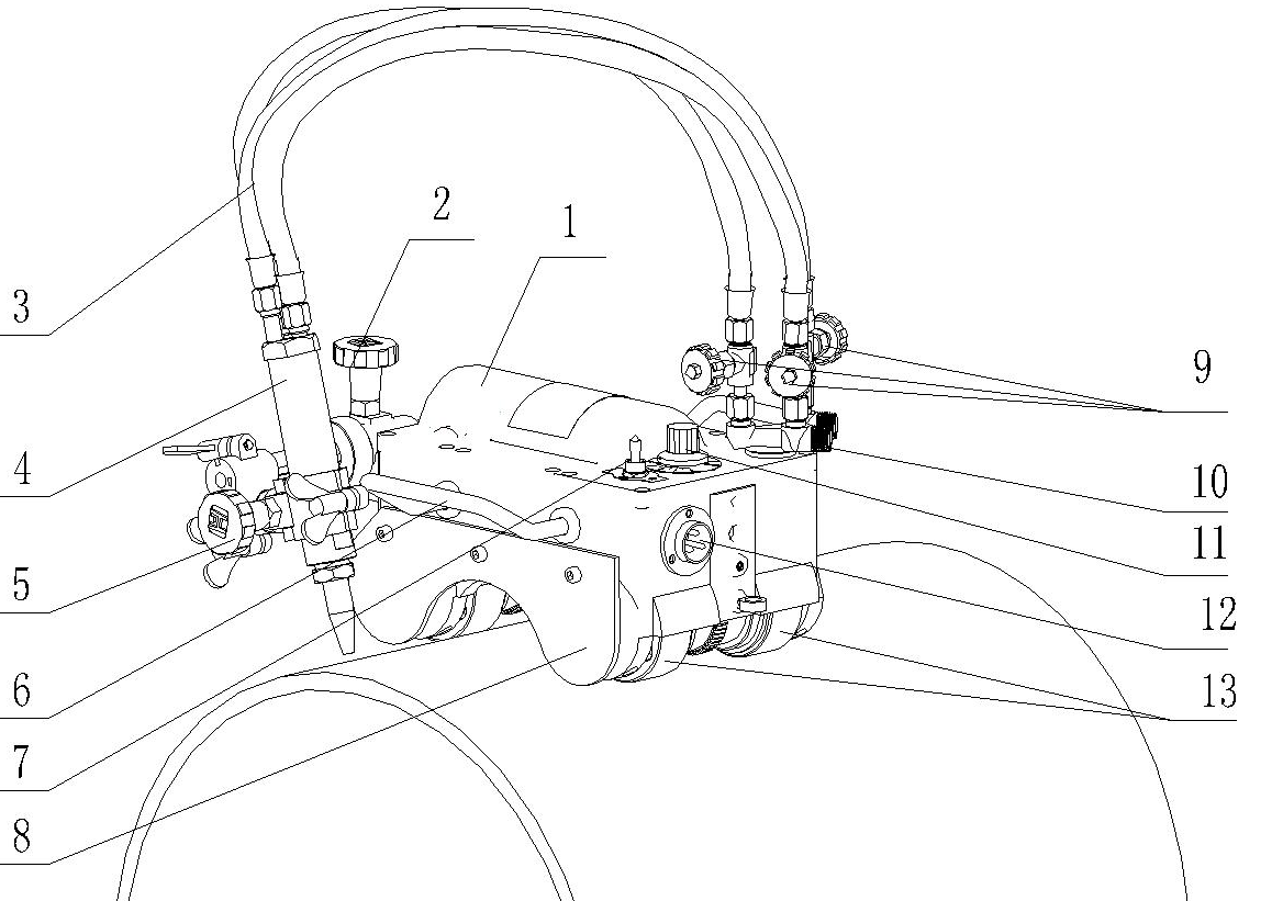 1.主體部件 2.橫向進(jìn)給手輪:可調(diào)節(jié)割炬水平位置 3.輸送氣體的軟管: 在氣體分配器和割炬之間 連接,三條氣管分別用于燃?xì)猓活A(yù)熱氧;切 割氧。 4.割炬 5.割炬調(diào)節(jié)手輪 6.把手 7.倒順開(kāi)關(guān): 改變機(jī)器的運(yùn)行方向,中間為停止位置 8.隔熱板 :阻礙因切割所產(chǎn)生的熱量向機(jī)器內(nèi)部擴(kuò)散 9.二通閥: 調(diào)節(jié)氣體流量的大小。 10.氣體分配器: 11.速度控制旋扭: 沿“10”方向旋轉(zhuǎn)該鈕可使裝置移動(dòng)加快, 沿“0”方向則使移動(dòng)減。 12.連接線(xiàn)插座 13.磁滾輪: 兩組磁性滾輪可使機(jī)器沿管壁平穩(wěn)爬行