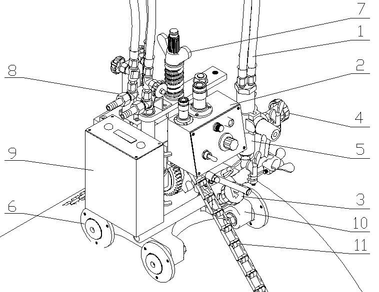 2.電器箱 3.橫向進給旋鈕:改變割炬水平位置 4.割炬升降手輪:調(diào)節(jié)割炬高度。 5.割炬:切割厚度:5~50mm 6.滾輪:通過四只滾輪使機器在管壁平穩(wěn)運行 7.大翼形螺母:擰緊該旋鈕,將逐漸收緊鏈條,可使機器牢固的固定在管子上。 8.氣體分配器:可將氣體分為預(yù)熱氧、快氧、切割氧 9.鋰電池 10.主體部件 11.鏈條:裝置沿導(dǎo)軌方向隨鏈條傳動而運行 |