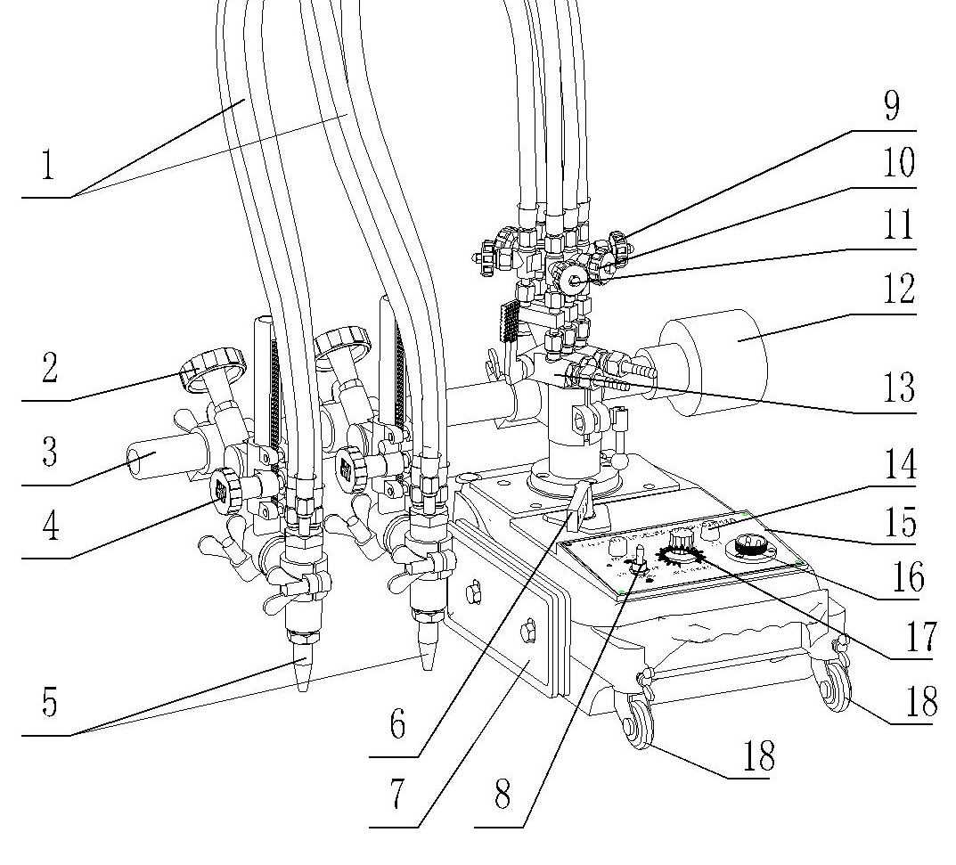 3.橫移齒條 4.割炬垂直調(diào)節(jié)手輪 5.割嘴