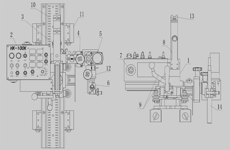 HK-100K由小車本體、控制箱,X-Y滑塊,焊槍夾具,導(dǎo)向輪,直線導(dǎo)軌等部件組成。
