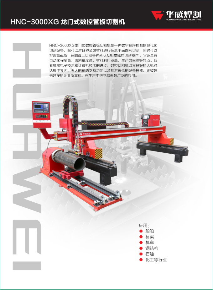 HNC-3000XG龍門式數控管板切割機是一種數字程序控制的現代化切割設備,除可以對各種金屬材料進行任意平面圖形切割,同時可以將圓管截斷,在圓管上切割各種形狀及相貫線的切割操作 ,它還具有自動化程度高、切割精度高、材料利用率高、生產效率高等特點。隨著機械電子技術和計算機技術的進步,數控切割機以其良好的人機對話操作界面、強大的輔助支持功能以及相對很低的設備投資,正被越來越多的企業所重視,在生產中得到越來越廣泛的應用。