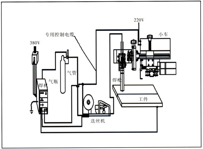 全位置自動焊接小車是一種半自動焊接設備,由小車本體、驅動裝置、控制裝置、焊槍夾持裝置組成。人工輸入工藝參數(shù)后,能夠按照一定運行軌跡實現(xiàn)全方位自動焊接。全位置自動焊接小車在10年前由國外(韓國、德國)引進,目前該技術已經(jīng)逐步國產(chǎn)化,并有部分企業(yè)開始生產(chǎn)該產(chǎn)品。該自動焊接裝置投資少,重量只有10kg左右,可隨‘丁件移動,只需與T廠現(xiàn)有的氣體保護焊機和220V電源簡單連接即可操作(如圖1)。操作門檻低,工人只需稍有焊接基礎,簡單培訓后即可上崗操作。全位置自動焊接小車有兩種行走方式,一種是沿專用軌道行走,軌道靠專用磁鐵或吸盤吸附在被焊接『[件上,采用齒輪齒條方式驅動。軌道有剛性軌道和柔性軌道兩種,剛性軌道走直線,實現(xiàn)平直或豎直焊縫自動焊接;柔性軌道可以隨工件焊縫彎曲,實現(xiàn)環(huán)形焊縫自動焊接。另一種是采用磁輪行走機構,小車靠強磁車輪吸附于工件表面,用導向輪定位,沿著焊縫行走,可以實現(xiàn)直線和曲線自動焊接。全位置自動焊接小車一般設有一個或兩個焊槍夾持裝置,用來夾持普通氣體保護焊機的焊槍。焊槍夾持裝置設有專用直線往返式擺動裝置,用數(shù)字方式調(diào)節(jié)擺動幅度、中心位置的移動、左停止時間、右停止時間及擺動速度,并具有停止焊接時焊槍自動停止在中心回位的功能。自動焊接擺動小車,與手工焊接相比,焊接幾乎不受焊工技術水平的影響;焊接過程穩(wěn)定,缺陷少,焊縫表面清潔,焊接質(zhì)量提高;焊接過程中,焊絲可以連續(xù)送進,熔敷速度快,減少了焊工換焊條或變換姿勢或休息的時間,大大提高了生產(chǎn)率;可進行一次性長距離焊接,焊接過程飛濺小,煙塵少,可以一人操作兩臺設備,大大降低了工人的勞動強度。